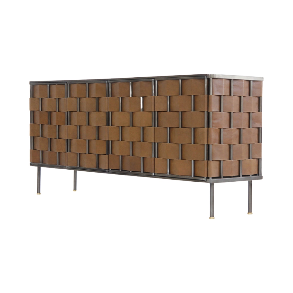 - El cuero como elemento central: Experimente la innovación en diseño como nunca antes: el cuero marrón claro cobra protagonismo en un fascinante estilo de tejido. Este enfoque único transforma el aparador, convirtiéndolo en una obra maestra visual y táctil cautivadora.