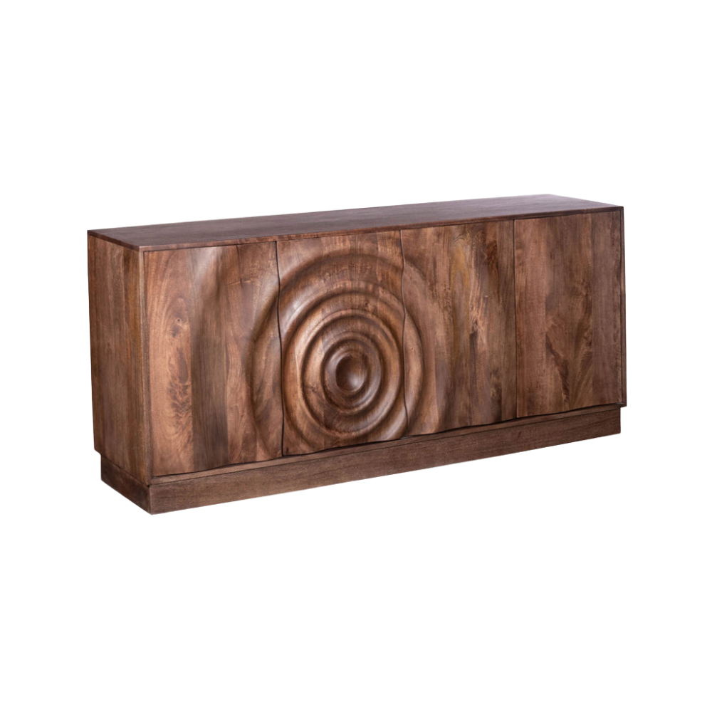 Presentamos el aparador Caracol: una obra maestra de artesanía y elegancia, elaborado meticulosamente en madera maciza de mango y presentado en un lujoso acabado marrón liso. Realce su espacio interior con este exquisito aparador que combina a la perfección, funcionalidad y estilo artístico.