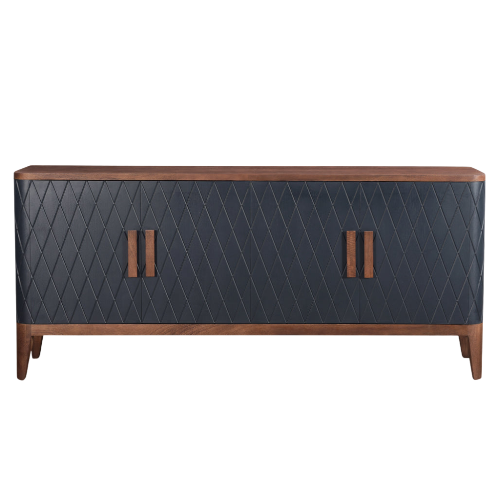 Evocando recuerdos de un paraíso rural, esta pieza combina un diseño rústico con un estilo moderno. Fabricada en madera de mango, está pintada de un azul oscuro que evoca el cielo nocturno sobre un bosque profundo y decorada con un distintivo motivo de diamantes. Los detalles de madera conservan su tono característico y están tratados para revelar los patrones naturales del árbol.