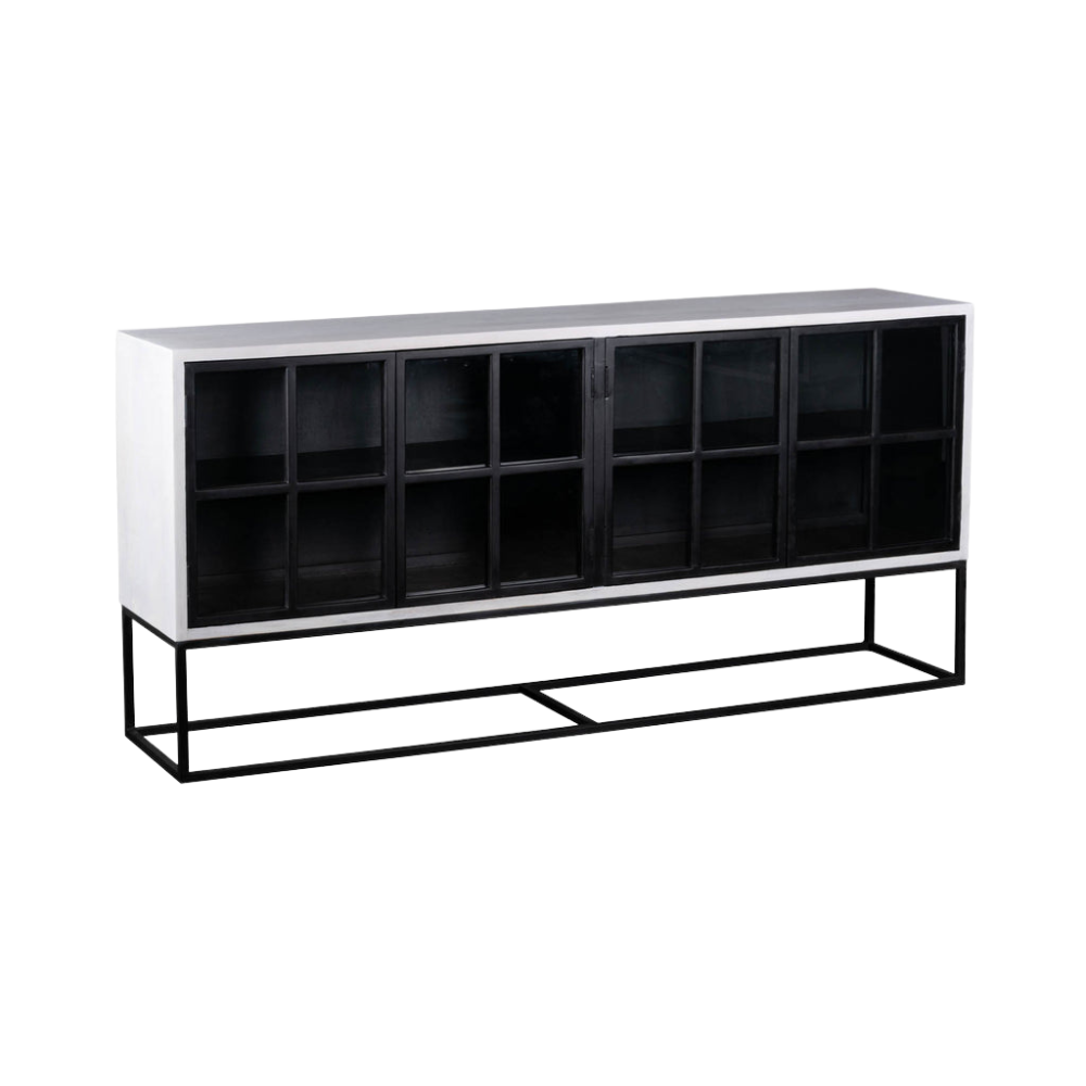 El Aparador con Jaula, una fusión de diseño exquisito y practicidad que redefine la elegancia del almacenamiento. Fabricado con la misma dedicación a la calidad, este aparador está fabricado en madera maciza de mango con un elegante acabado blanco lavado, aportando un toque de belleza atemporal a su comedor o sala de estar.