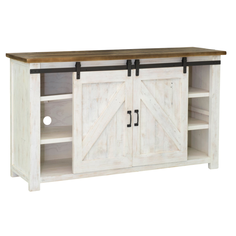 Este artículo encarna el encanto rústico natural. Esta colección presenta un acabado blanco antiguo, puertas corredizas estilo granja y mucho espacio de almacenamiento.