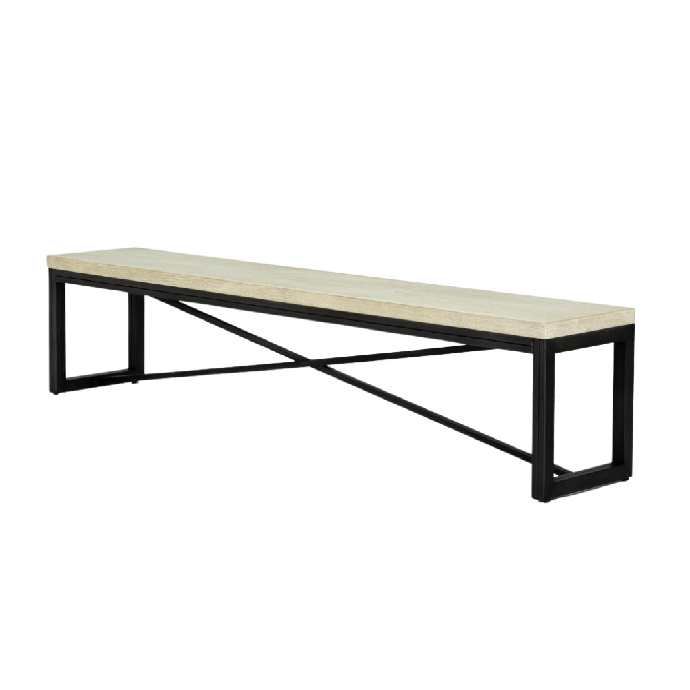 De estilo rústico y artesanal, este banco con patas en forma de U y un marco de metal en forma de cruz es un complemento perfecto para la mesa de comedor a juego.