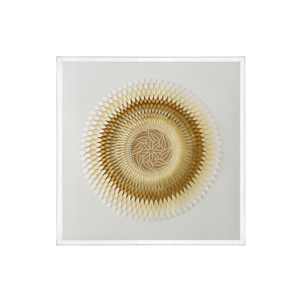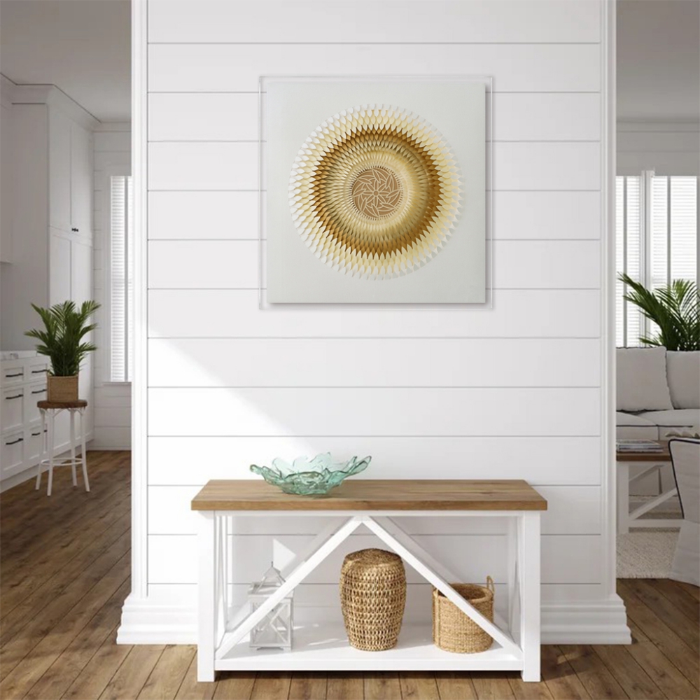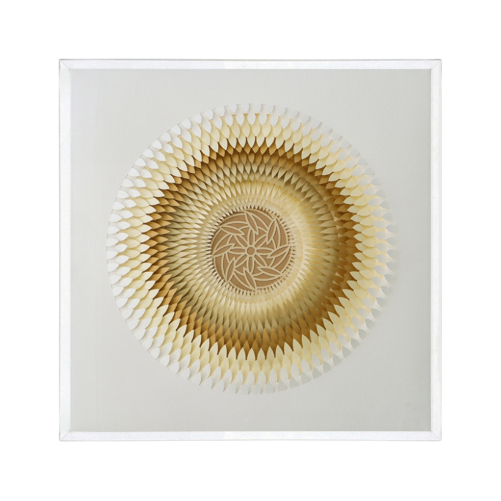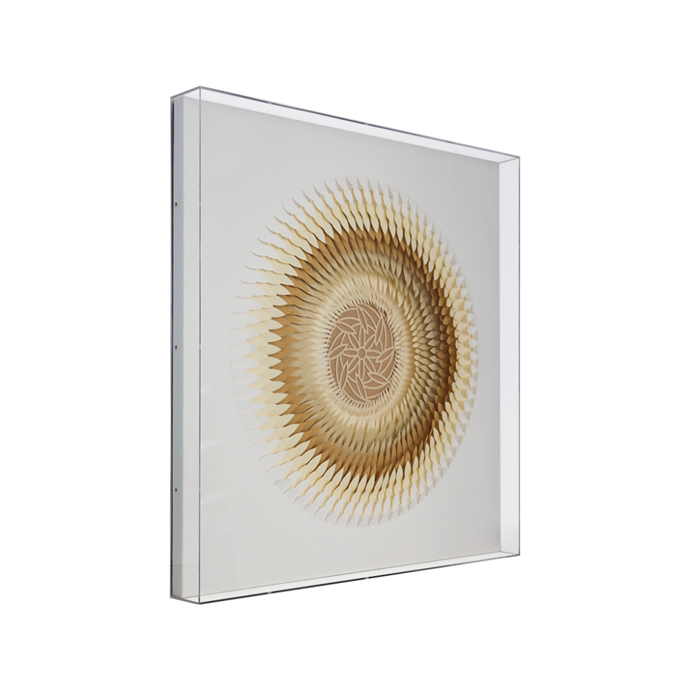 Un impresionante cuadro de acrílico tridimensional que recrea la forma de una semilla de flor en tonos cafés.