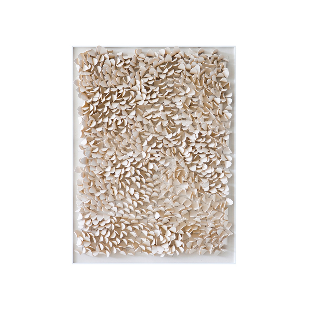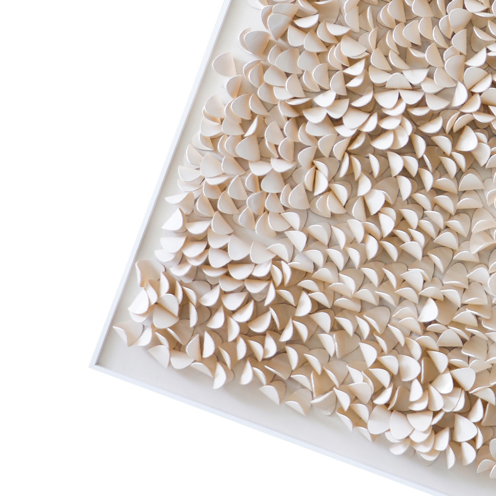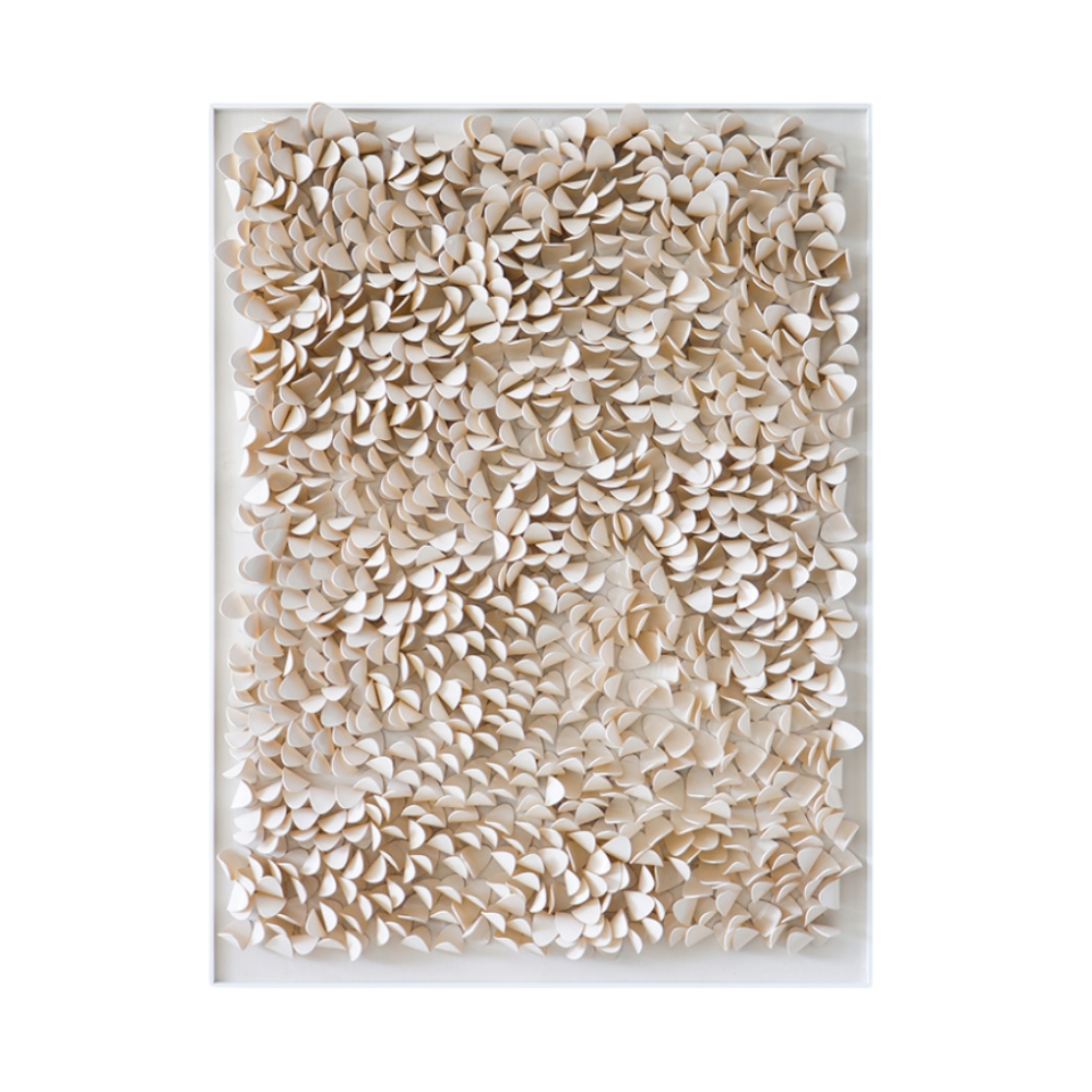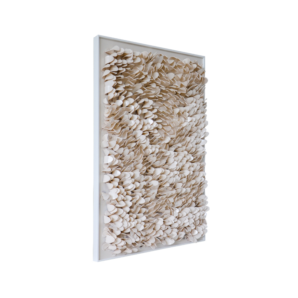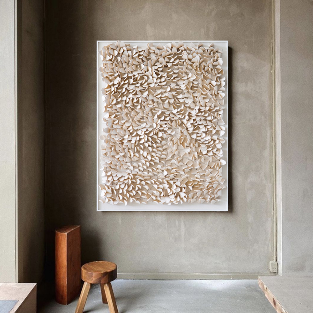 Un cuadro decorativo tridimensional de impresionante belleza, con texturas en acrílico beige y una elegante caja de acrílico.