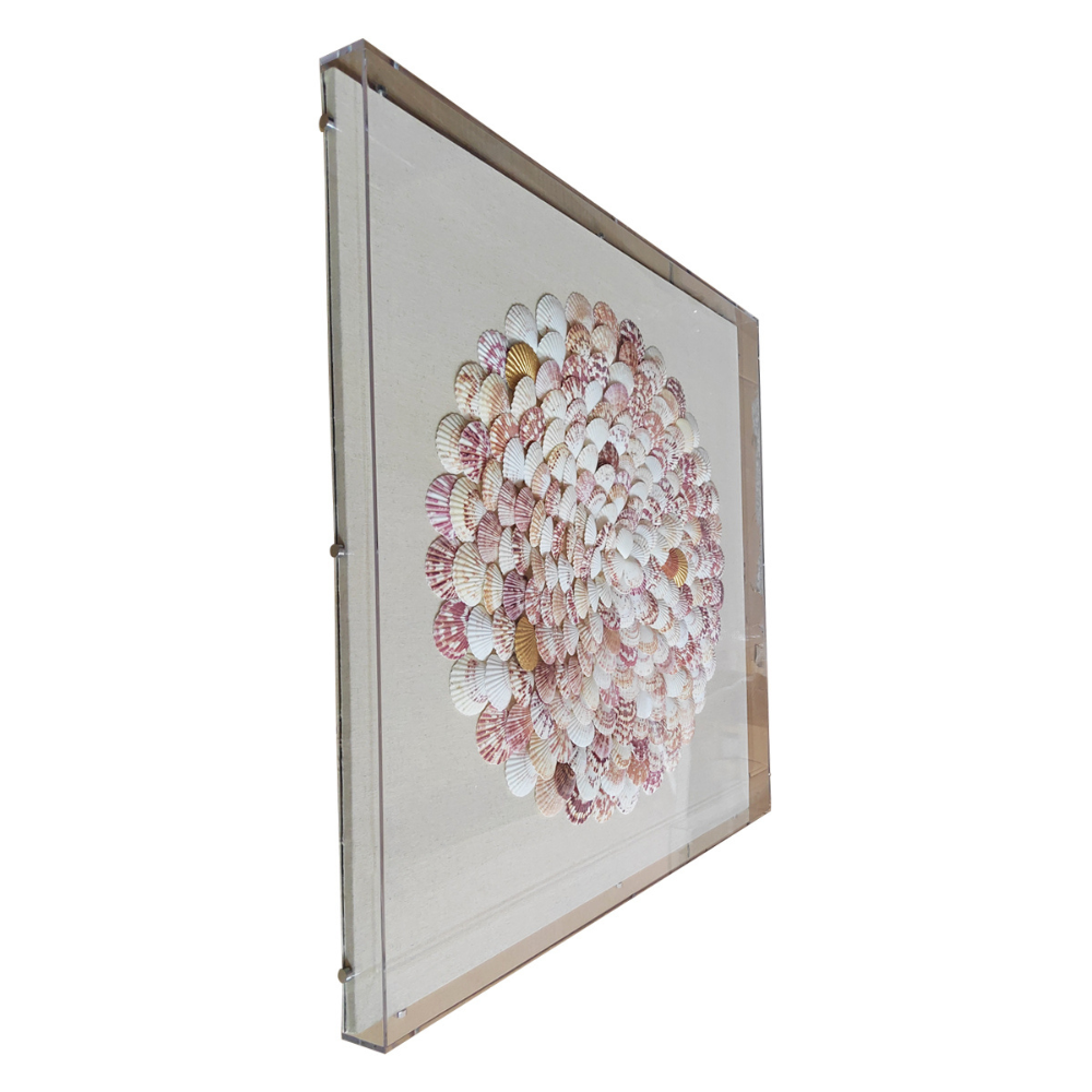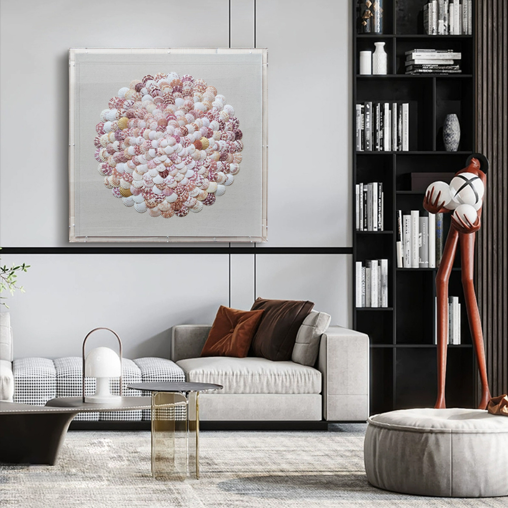 Este cautivador cuadro presenta un fascinante patrón circular formado por conchas de mar, creando una composición tridimensional que deleitará los sentidos.