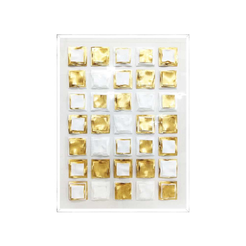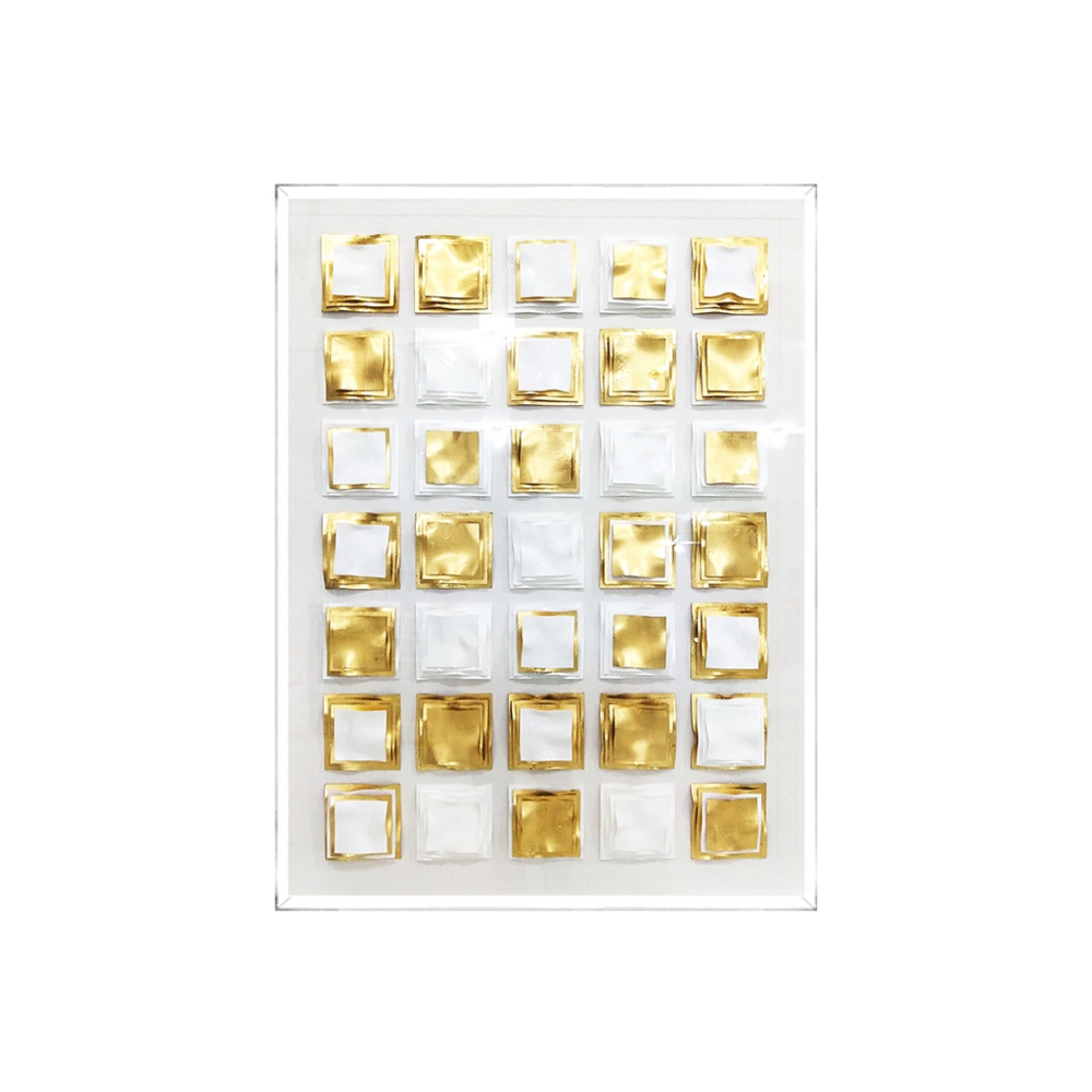 Una obra maestra de arte en acrílico que presenta 35 cuadros dorados y blancos, meticulosamente dispuestos en un arreglo cautivador.