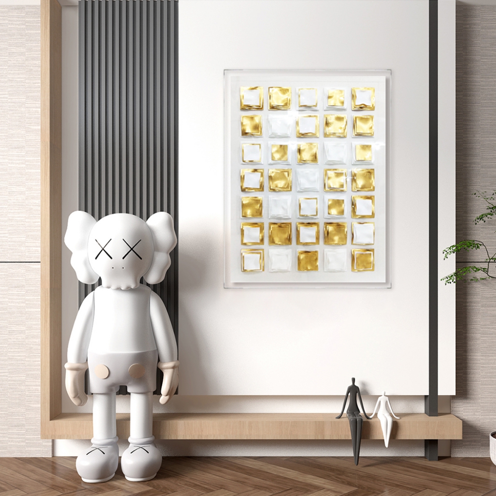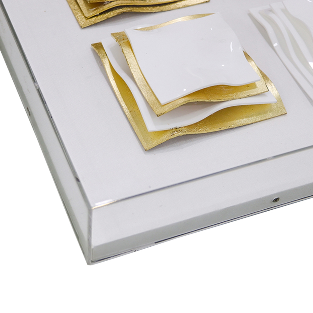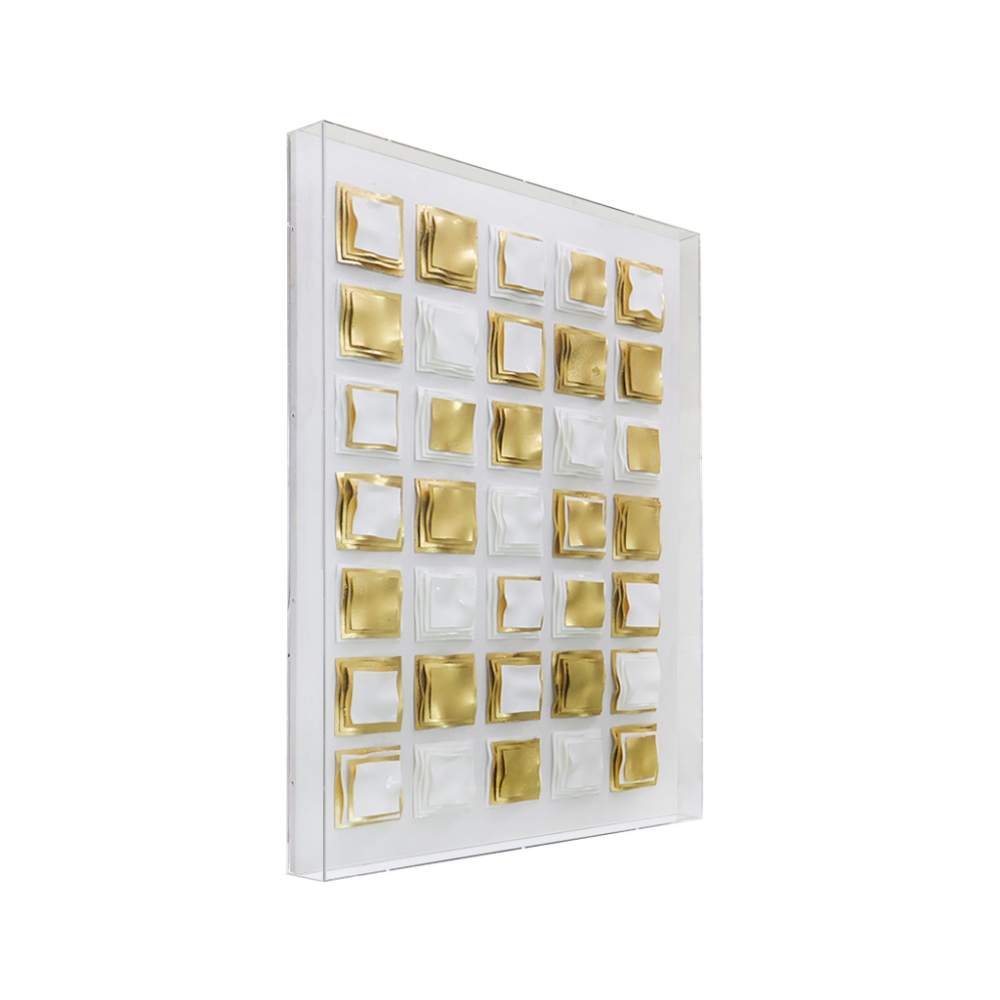 Una obra maestra de arte en acrílico que presenta 35 cuadros dorados y blancos, meticulosamente dispuestos en un arreglo cautivador. Este cuadro decorativo transmite una sensación de elegancia y sofisticación. Cada cuadro ha sido creado con esmero para capturar la belleza y la armonía de los tonos dorados y blancos. Esta pieza de arte contemporáneo añade un toque de luminosidad y refinamiento a cualquier espacio, creando un punto focal impresionante que atrapa la mirada y evoca una sensación de serenidad y belleza etérea.