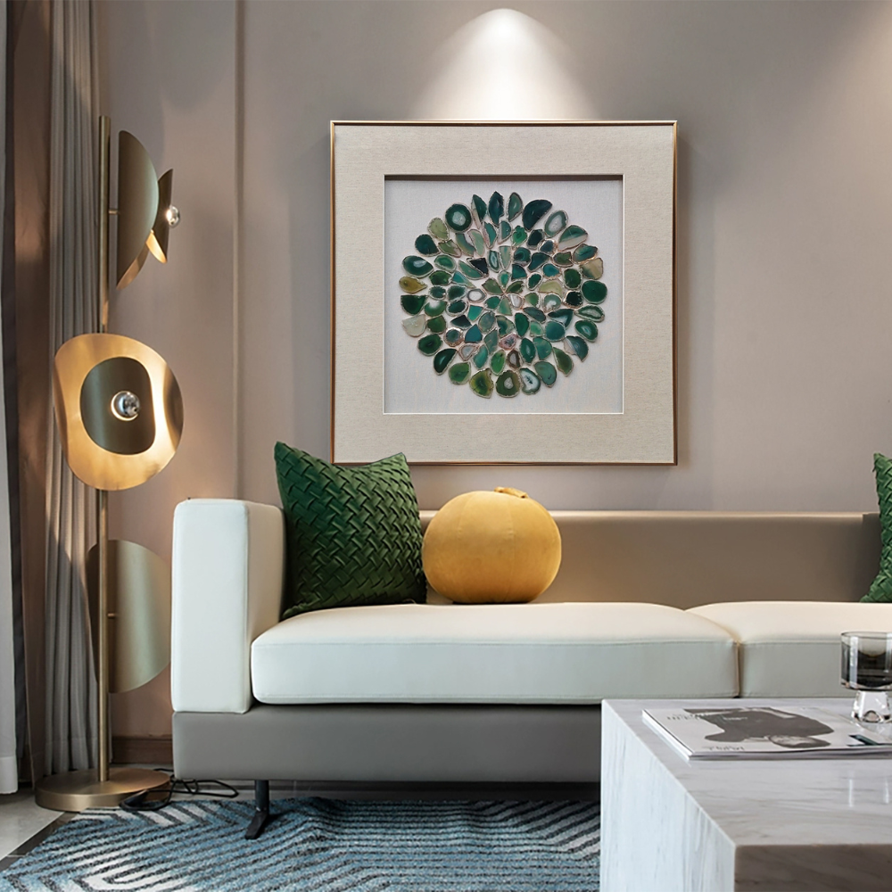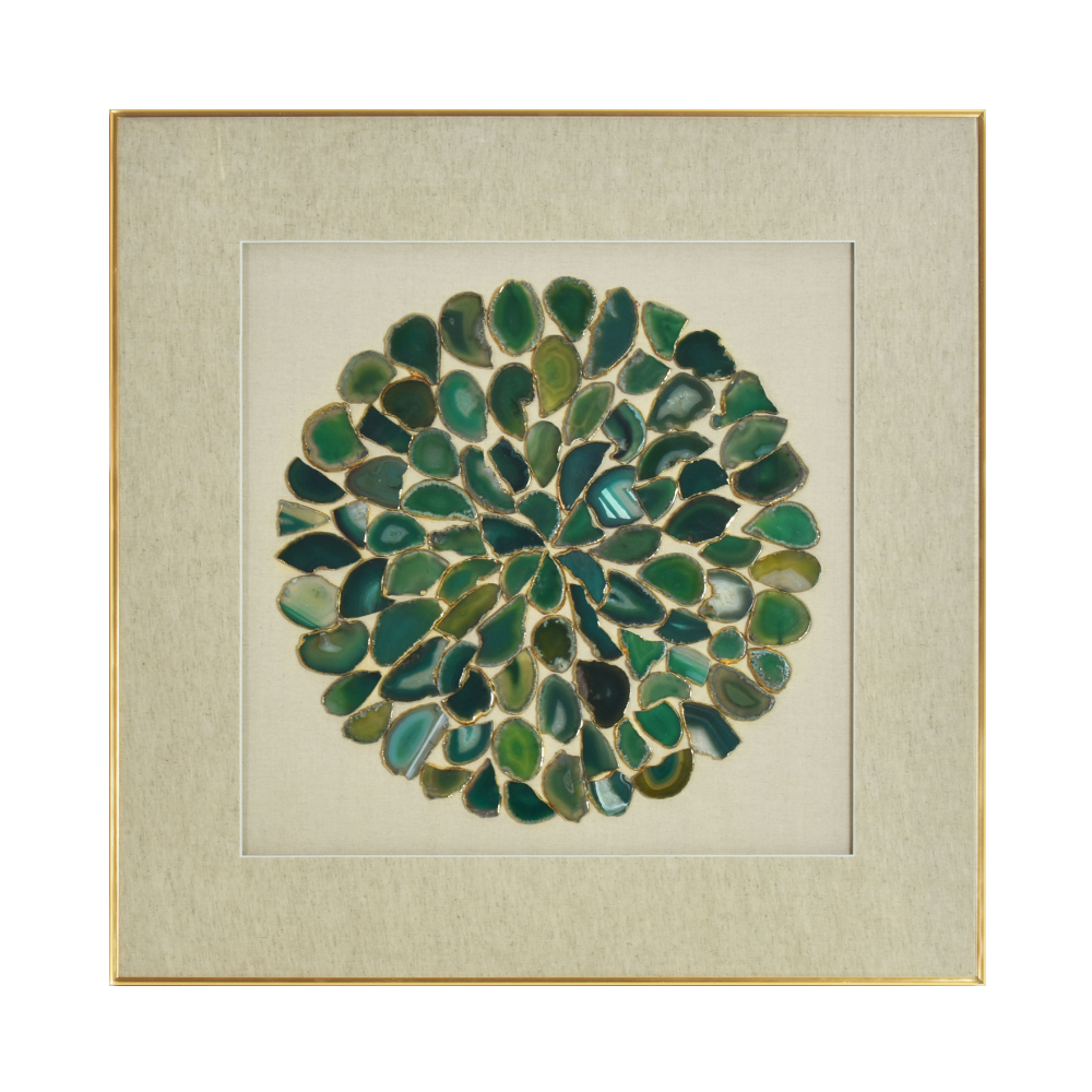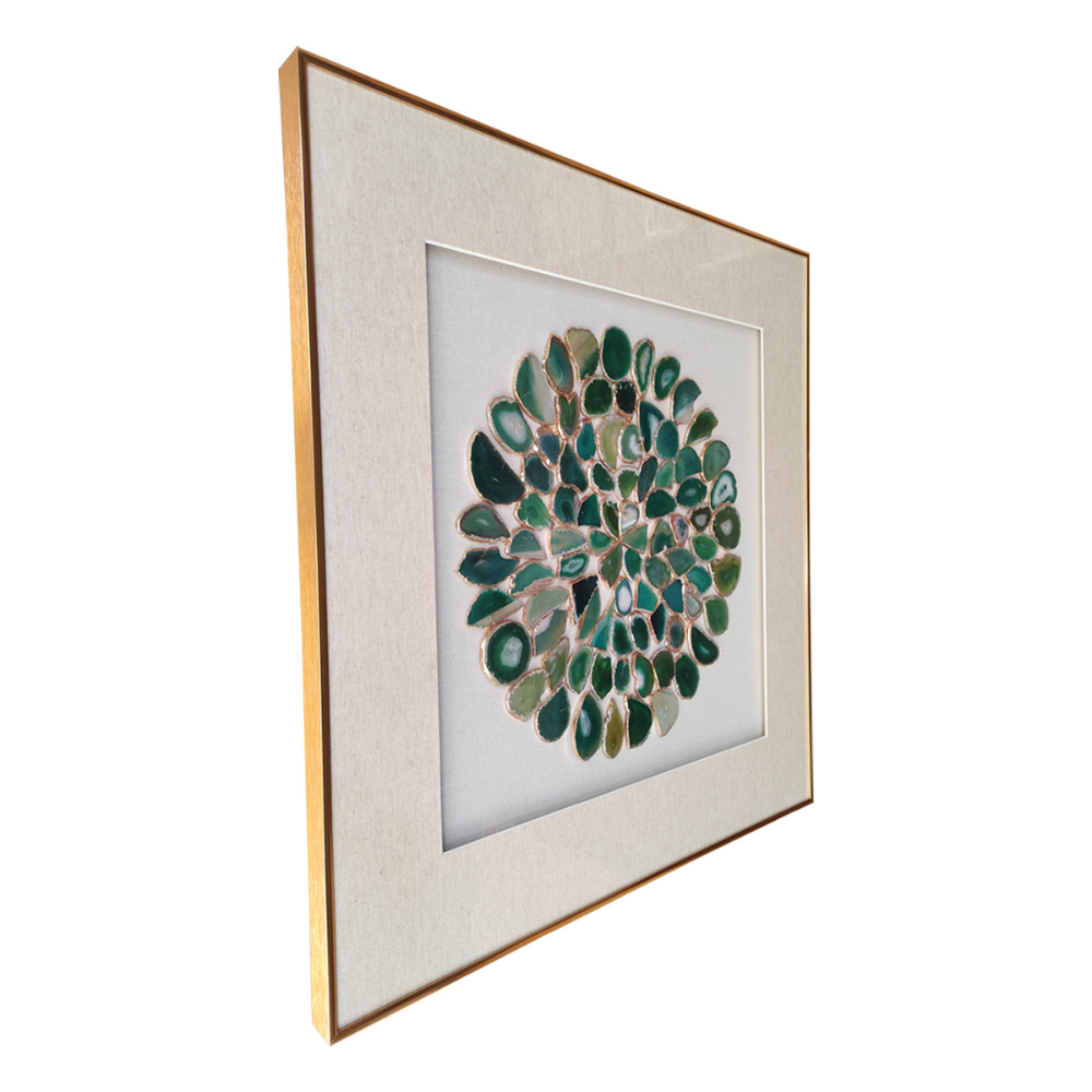 Este cautivador cuadro presenta un hermoso patrón circular formado por piedras ágatas en tonos verdes, creando una composición visualmente impactante. Las piedras ágatas, con sus vibrantes tonalidades de verde, se entrelazan entre sí de manera armoniosa, dando vida a un diseño único y fascinante. Cada piedra ágata, con su textura única y colores variados, refleja la luz de manera Fascinante, creando un juego de luces y sombras que añade profundidad y dinamismo al cuadro. La combinación de tonos verdes transmite una sensación de serenidad y conexión con la naturaleza. Este cuadro se convertirá en un punto focal destacado en cualquier espacio, ya sea en el salón, el dormitorio o incluso en una sala de reuniones. Es una elección perfecta para aquellos que aprecian la belleza de las piedras naturales y buscan añadir un toque de estilo y distinción a su entorno.