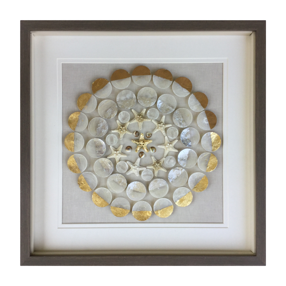 Este cuadro decorativo presenta ocho estrellas de mar cuidadosamente colocadas sobre un fondo gris. Los círculos en concha nácar añaden un toque de brillo y textura. El marco de poliestireno café oscuro completa la composición, creando una pieza elegante y encantadora.