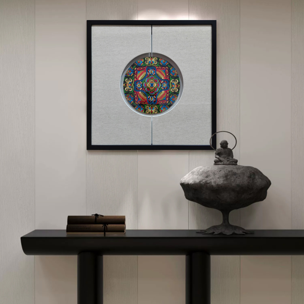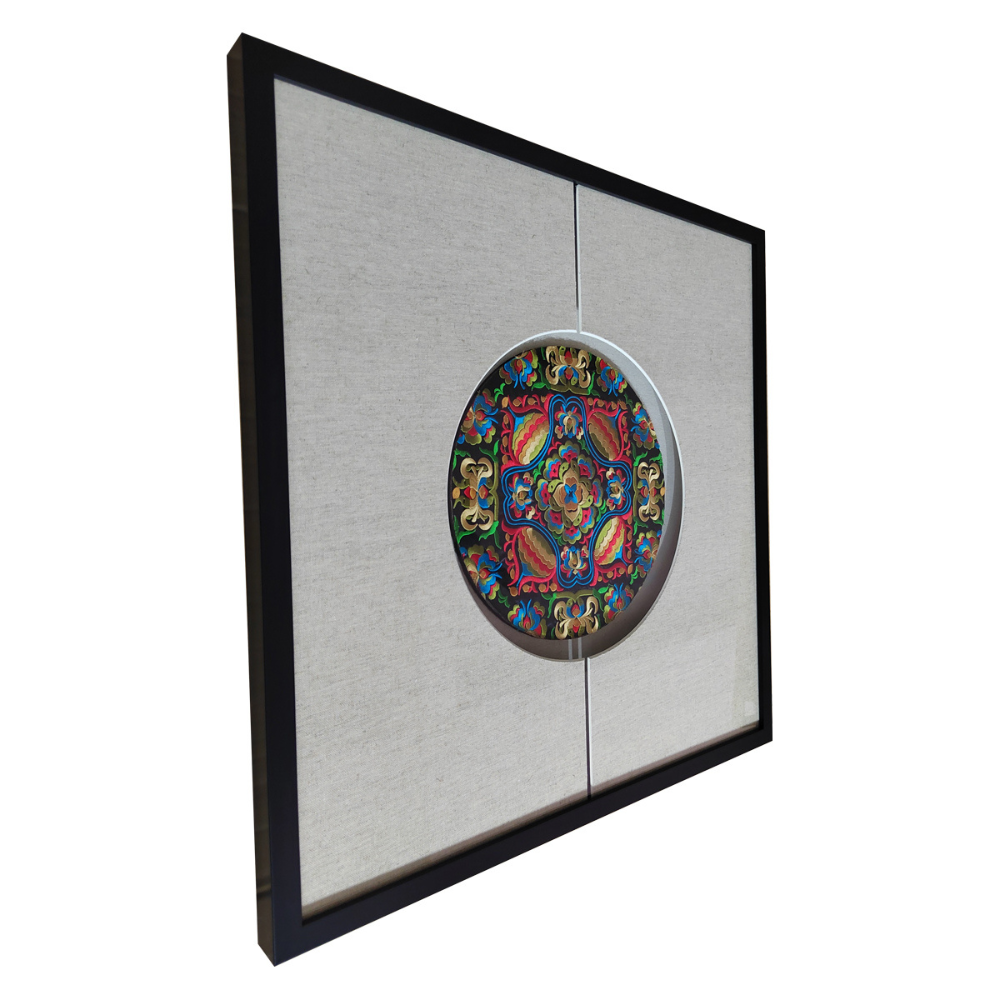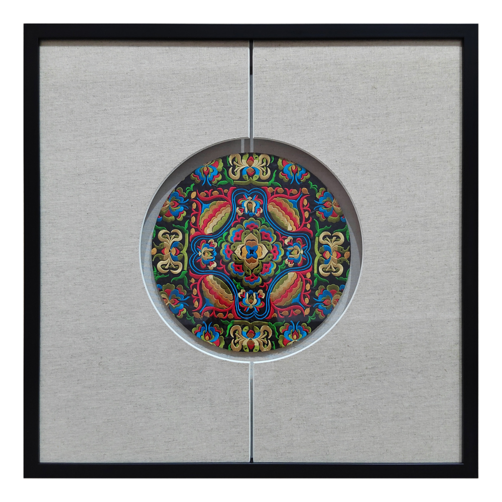 Este impresionante cuadro presenta un cautivador arte bordado con un tema étnico, que evoca la belleza y la tradición de culturas ancestrales. El bordado detallado muestra motivos y diseños geométricos intrincados, combinando colores vivos y patrones simbólicos. El fondo del cuadro está cuidadosamente confeccionado en textil, añadiendo una textura suave y agradable que complementa y realza el arte bordado. Los colores y las texturas del fondo enmarcan y resaltan el trabajo artesanal, creando un efecto visual armonioso y fascinante. Con unas medidas de 60×60 cm, este cuadro es perfecto para ser exhibido en cualquier espacio. Ya sea en la sala de estar, el comedor o incluso en un rincón especial de la habitación, su presencia aportará un toque de estilo y personalidad. Este cuadro con arte bordado étnico es una pieza única que capturará la atención y generará admiración. Es ideal para aquellos que valoran la artesanía, la cultura y la belleza de lo hecho a mano, y desean agregar un toque distintivo y cultural a su entorno.