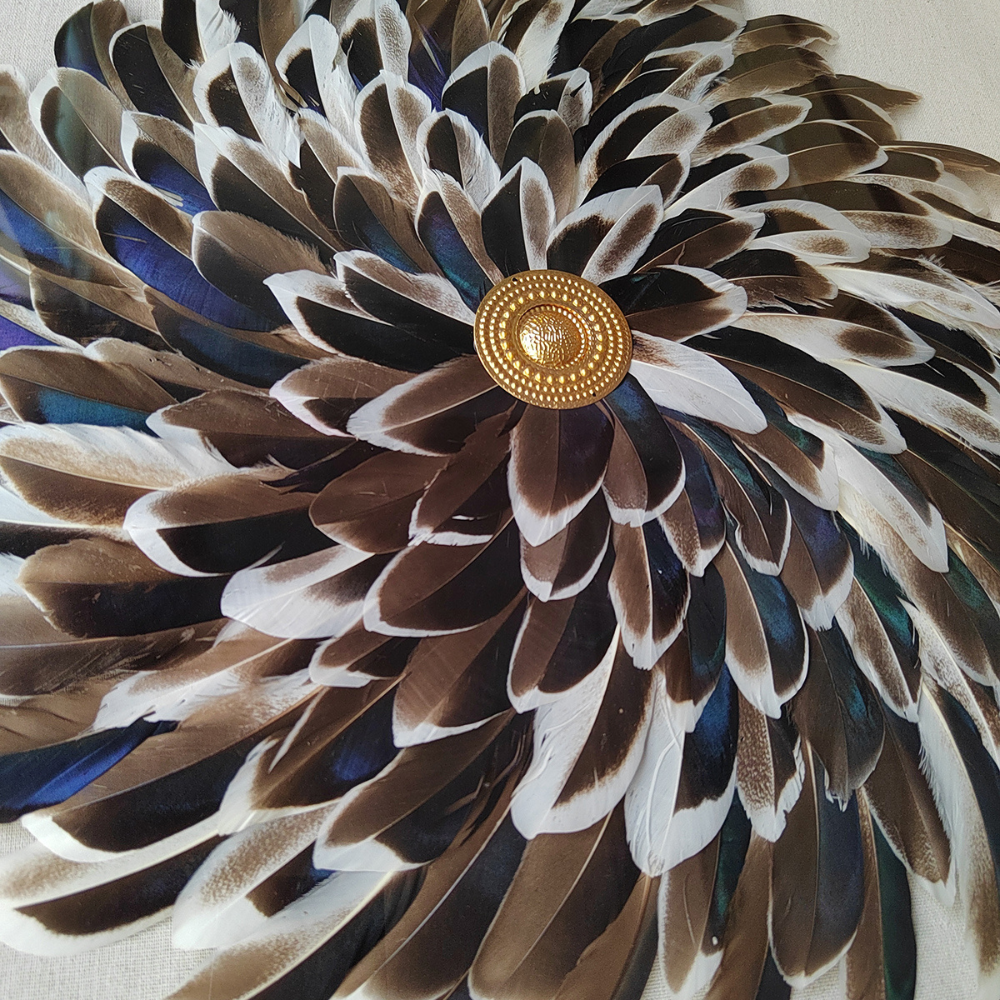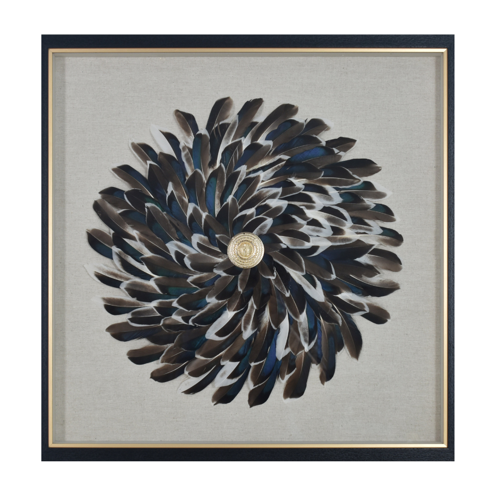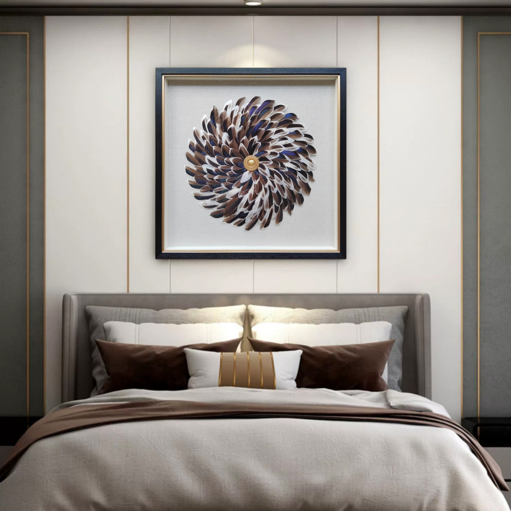 Este impresionante cuadro presenta un cautivador patrón circular formado por plumas en tonos azules, negros y blancos, que se entrelazan en armonía para crear una obra de arte sorprendente.