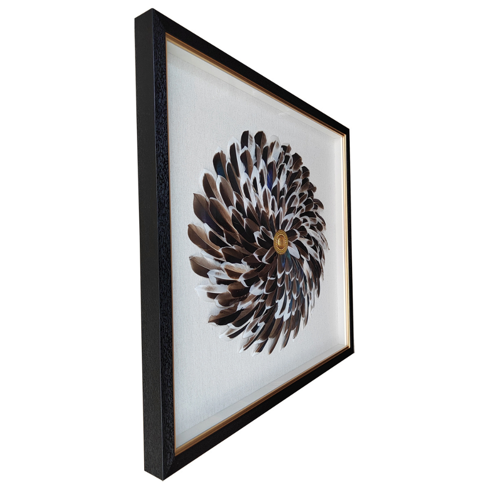 Este impresionante cuadro presenta un cautivador patrón circular formado por plumas en tonos azules, negros y blancos, que se entrelazan en armonía para crear una obra de arte sorprendente. El contraste entre los colores vibrantes de las plumas y el fondo arena añade un efecto visual fascinante. El marco de poliestireno complementa perfectamente el cuadro, proporcionando un contorno elegante y resaltando la belleza de la composición. Cada pluma está meticulosamente colocada, creando un patrón hipnotizante que se extiende desde el centro hacia los bordes del cuadro. Colocado en cualquier espacio, ya sea en la sala de estar, el dormitorio o incluso en un estudio, este cuadro captará la atención de todos y agregará un toque de estilo contemporáneo. Es una elección perfecta para aquellos que buscan una pieza de arte que refleje su aprecio por la belleza de la naturaleza y la creatividad humana.