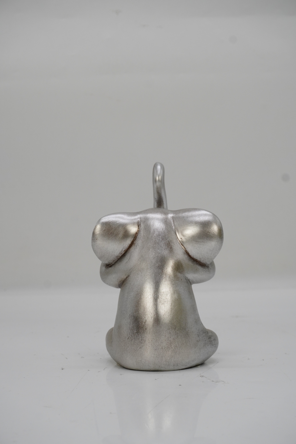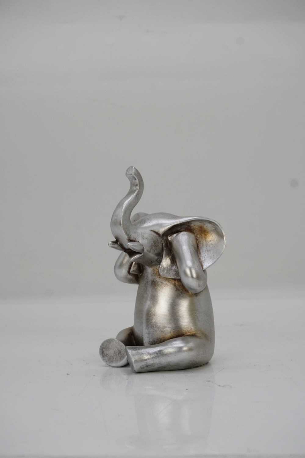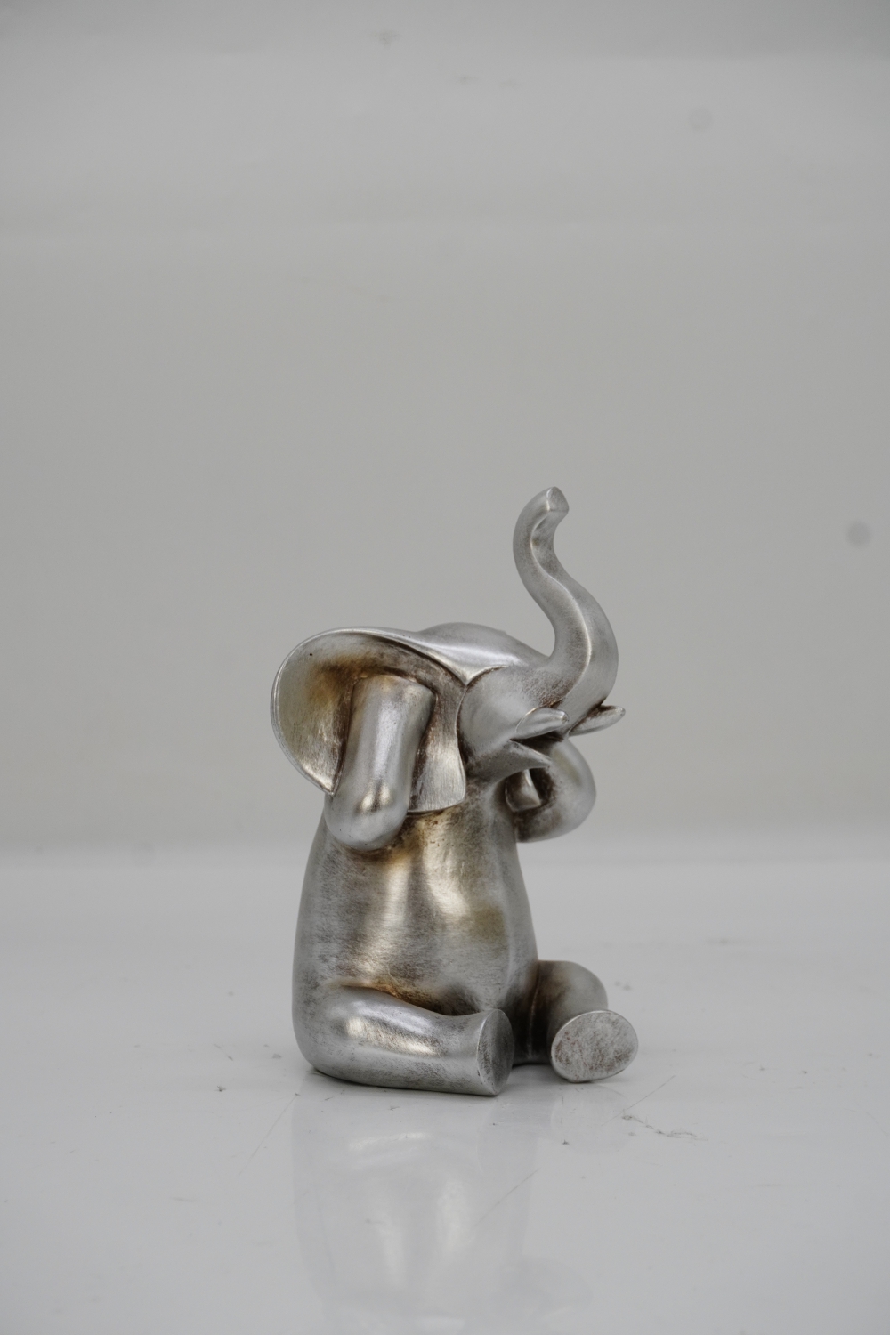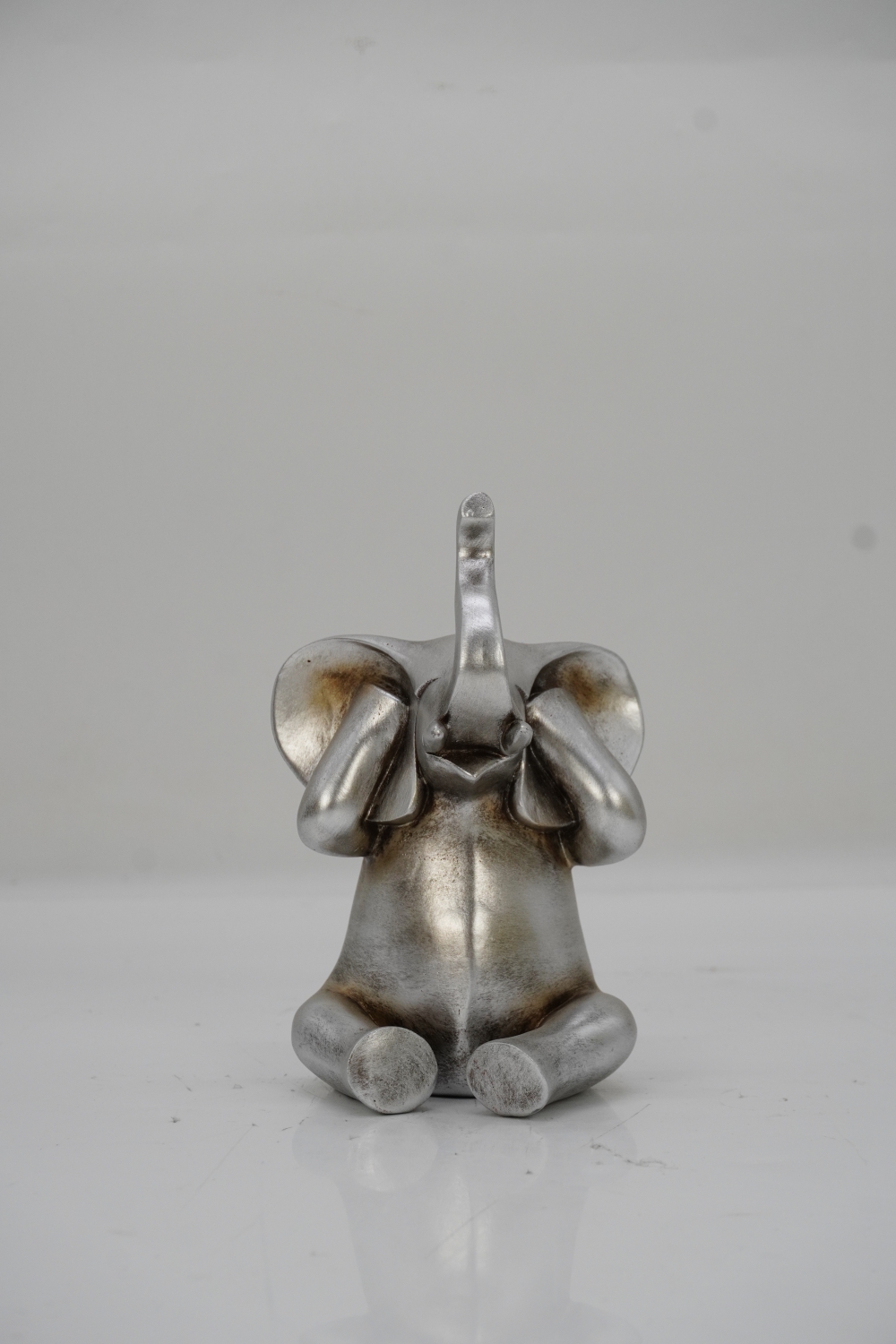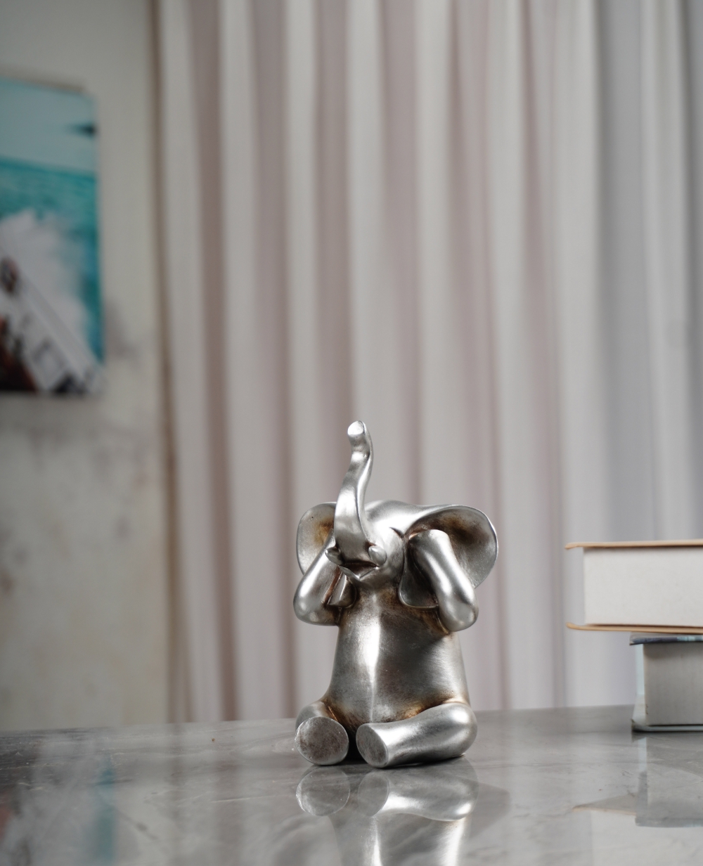 Esta figura de elefante en color plata es una obra de arte encantadora y única. Hecha de poli resina, el material utilizado garantiza una apariencia elegante y duradera. La figura captura la imagen de un elefante con las manos en la cara, una posición que transmite una sensación de sorpresa o asombro.