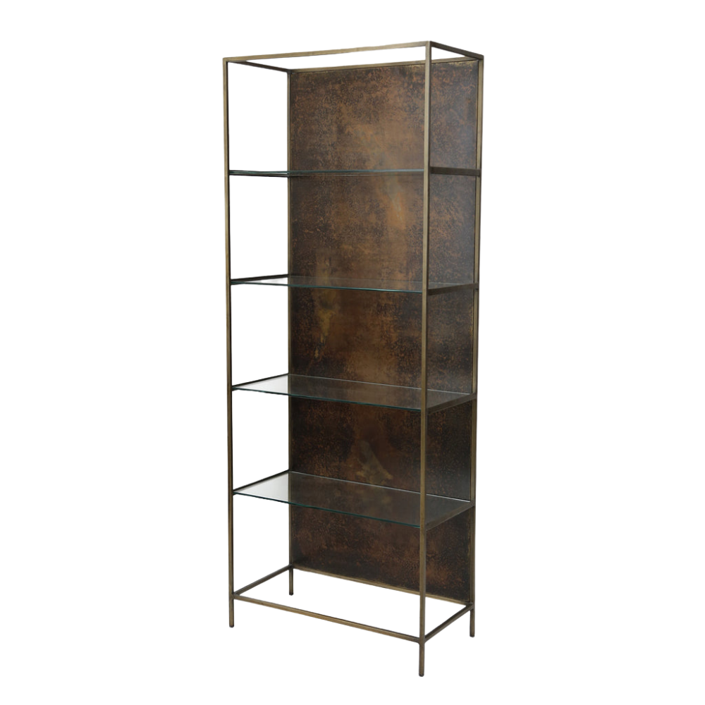 ¡Diseñada para ser audaz y destacar! Esta pieza fue diseñada con estantes de vidrio y detalles de latón antiguo para darle un toque industrial y glamuroso a tu espacio.