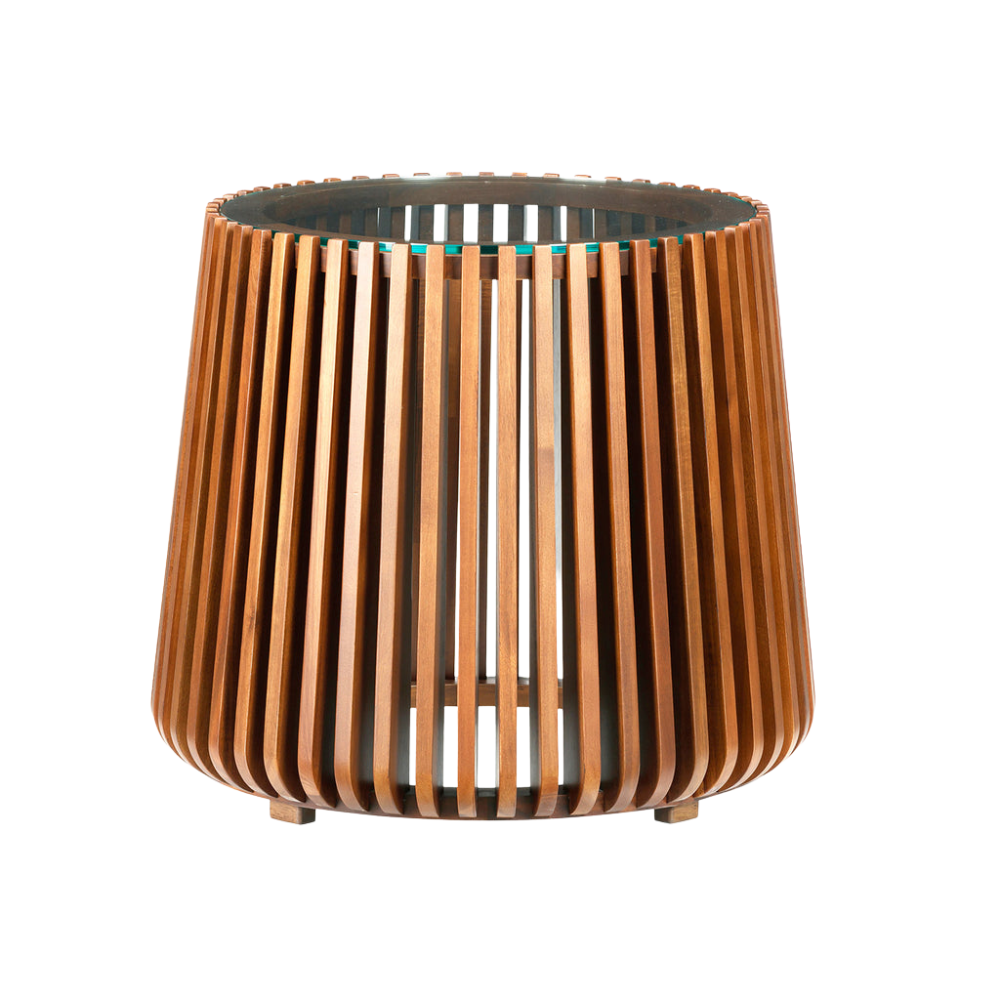 La calidez de la madera de acacia contrasta a la perfección con el diseño de los paneles de madera y la elegante tapa de cristal.