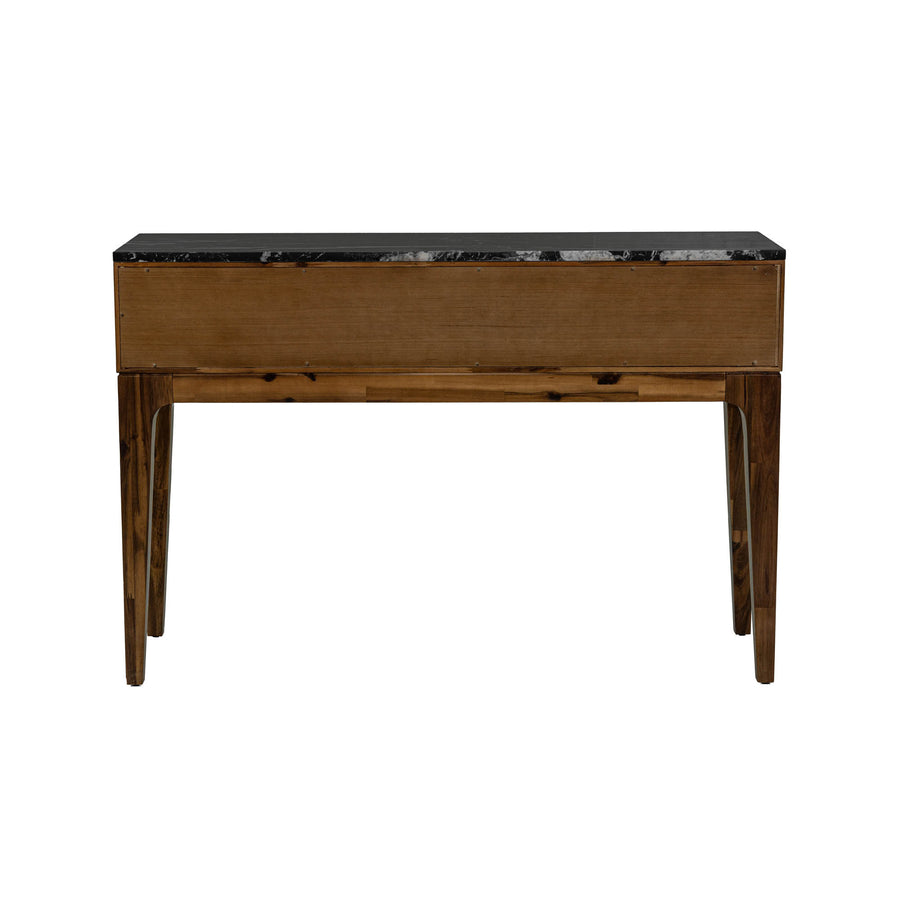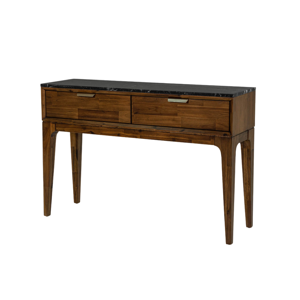 - Fabricada en acacia maciza con acabado color nogal y tiradores de color latón. También puede usarse como escritorio.