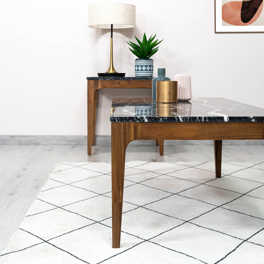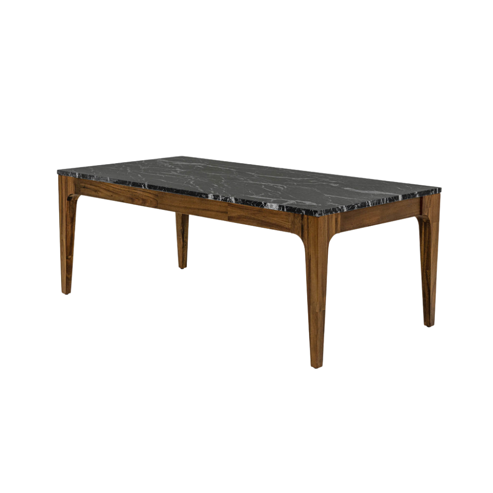 ¡Un refinamiento de mediados de siglo! Los ricos tonos de madera de nogal, combinados con el elegante mármol negro, crean una apariencia refinada.