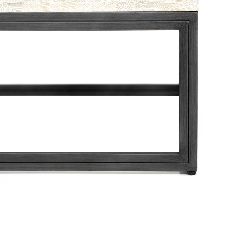 - Un lavado de blanco y un ligero efecto desgastado añaden un susurro de color y textura para realzar la presencia escultórica de esta llamativa mesa.