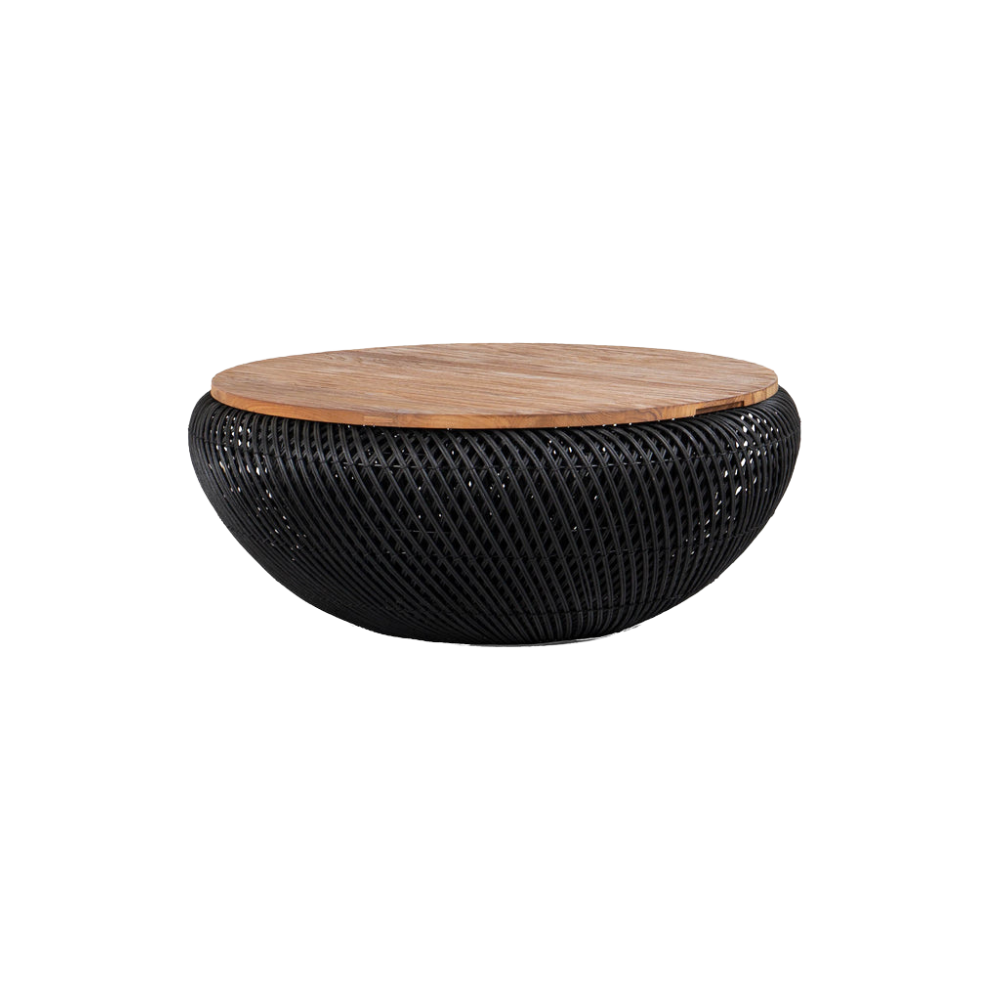 Fabricada con materiales naturales de origen ético, esta mesa rebosa carácter e historia, y también sirve como espacio de almacenamiento. El tablero es de teca reciclada resistente con una base de ratán tradicional. La base tiene un acabado negro que evoca la roca volcánica o la medianoche tropical, mientras que el tablero refleja patrones únicos que solo se encuentran en la naturaleza.