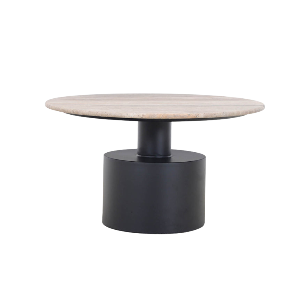 - Esta mesa de centro combina de forma espectacular la elegancia natural con el diseño moderno. Presenta una superficie redonda de travertino en un suave tono gris.