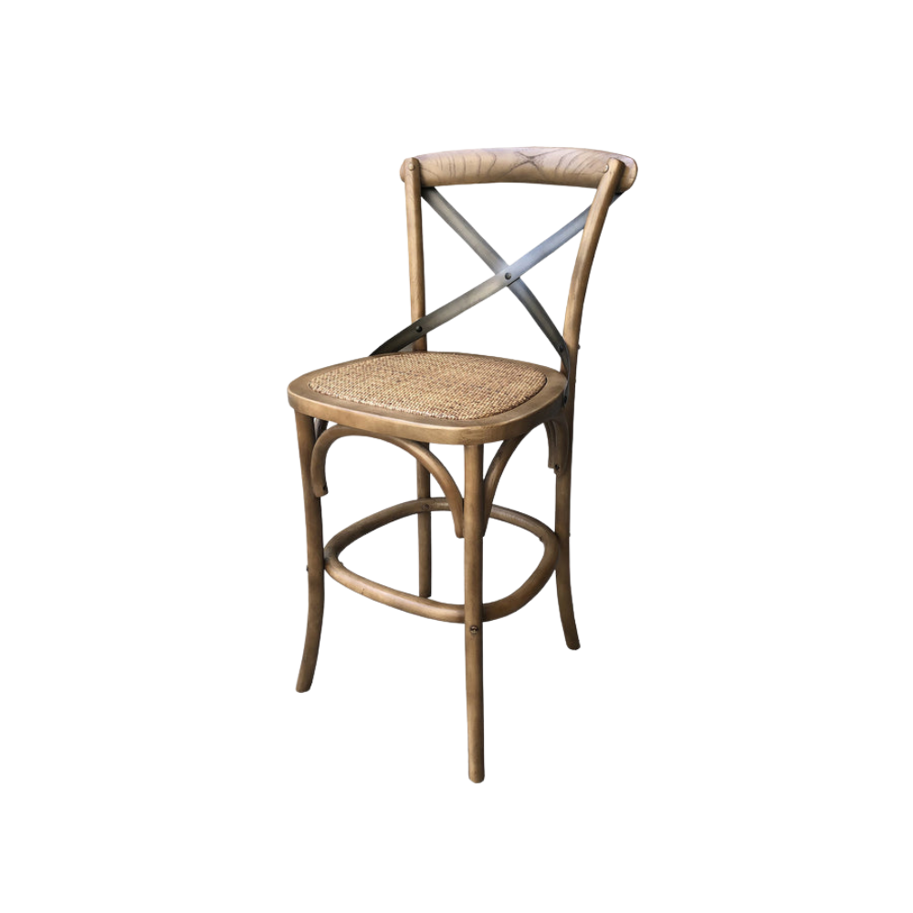 Este taburete de madera con respaldo cruzado no solo ofrece un asiento elegante, sino que también es duradero. Fabricado con asiento de ratán y acabado con un respaldo cruzado de metal, ofrece soporte con estilo.