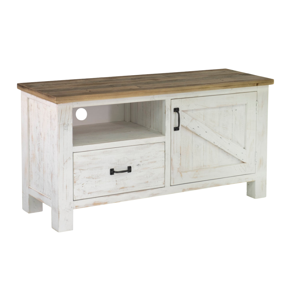 Este artículo encarna el encanto rústico natural. Esta colección presenta un acabado blanco antiguo, puertas corredizas estilo granja y mucho espacio de almacenamiento.